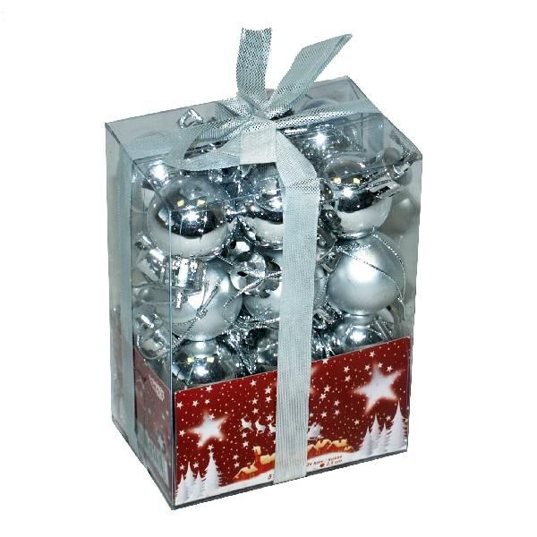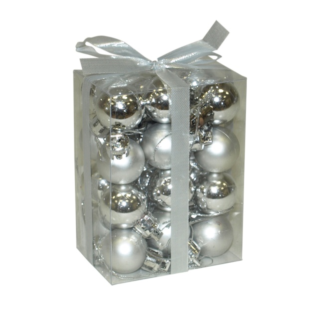 Srebrne kuglice prečnika 2,5 cm, izrađene od kvalitetne plastike. U pakovanju se nalazi 24 komada, 12 sjajnih i 12 mat.